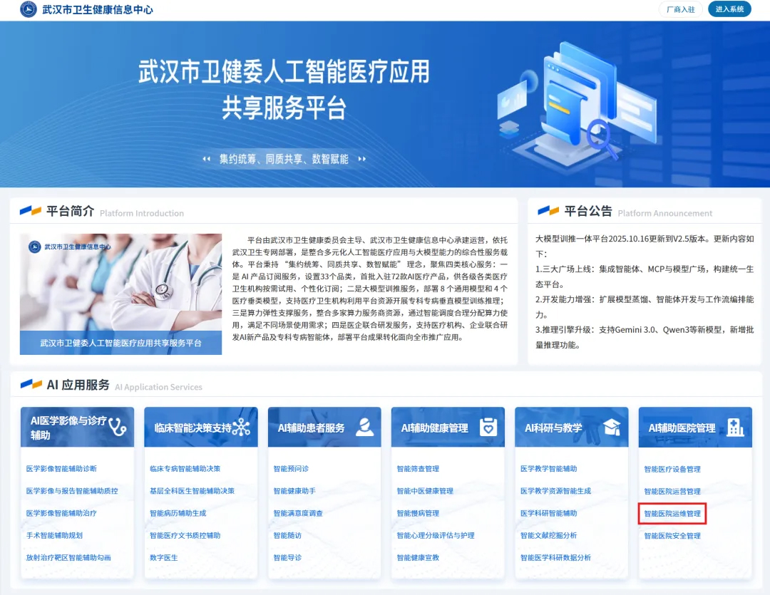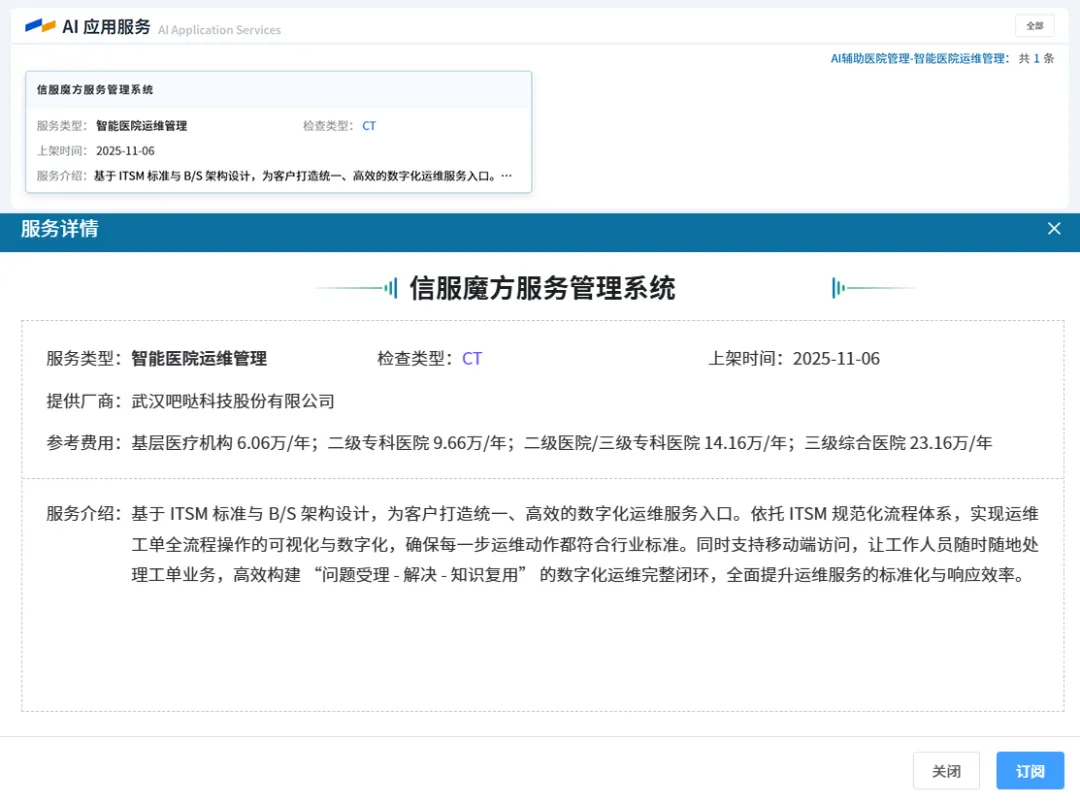 本次发布的武汉人工智能医疗应用共享服务平台(网址:https://whai.whhealth.org.cn/) 以“集约统筹、同质共享、数字赋能”为核心理念,集AI产品订阅、大模型训推、算力弹性支撑、医企联合研发为一体,致力通过一站式订阅服务,解决医疗AI领域长期存在的资源分散、重复建设与算力成本高昂等痛点,实现大模型、数据、算力等全要素统筹,并形成了涵盖便民、惠医、助管、促研等全场景的首批72款AI医疗产品生态。其中,吧哒科技自主研发的“信服魔方服务管理系统”精准契合智能医院运维管理新场景,入选其中,在“助管”场景中通过人工智能辅助医院提升运营管理效能,解决医院精细化管理的实际痛点,实现对医院后勤、资产、空间、安全、能耗等管理要素的全面数字化与智能化闭环。